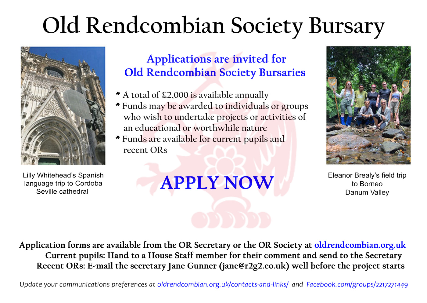 If you or a group would like to apply for the annual Old Rendcombian Society Bursary, please download and complete the application Word docx form here, or download and complete the application pdf form here (4 pages).